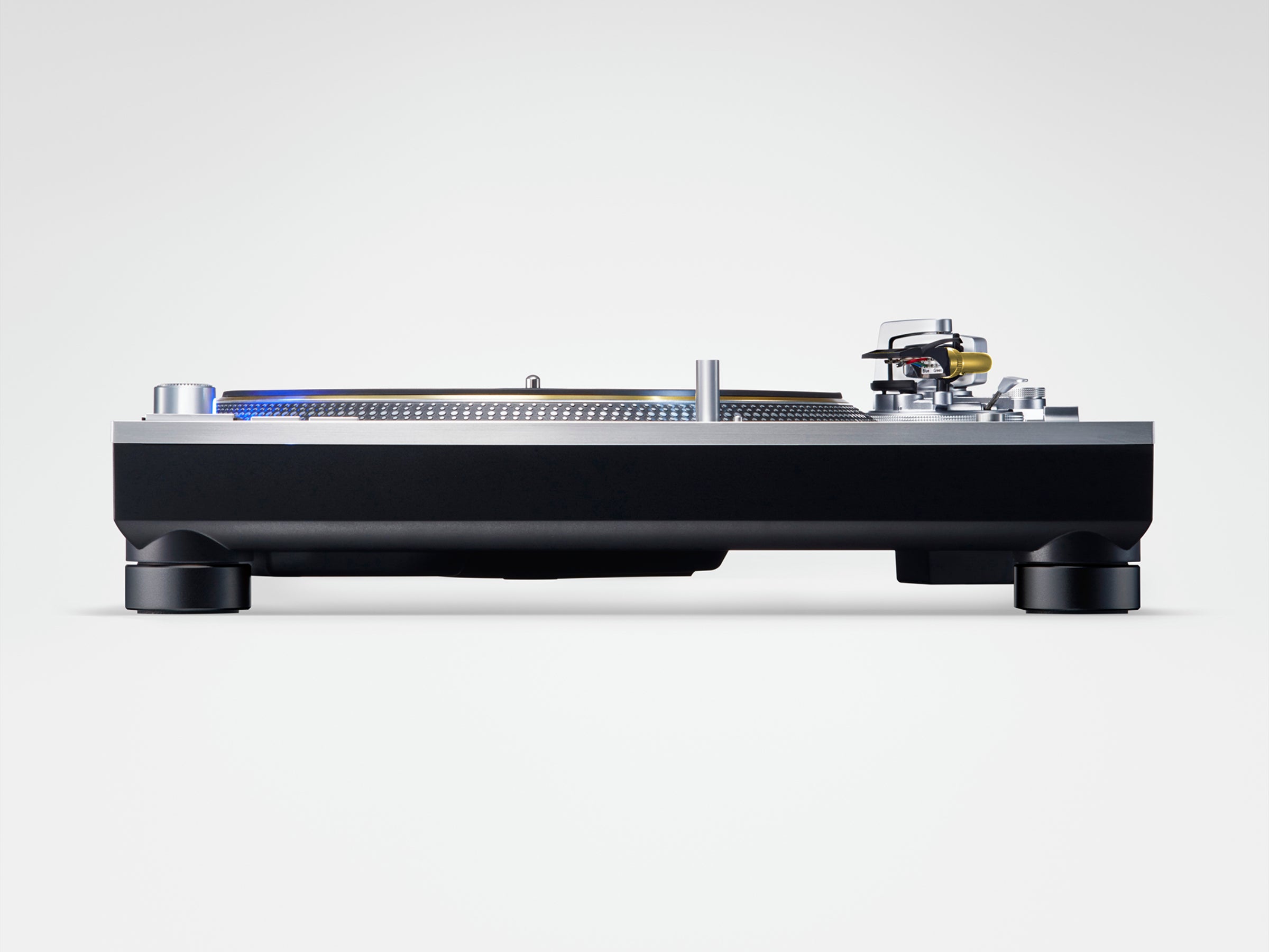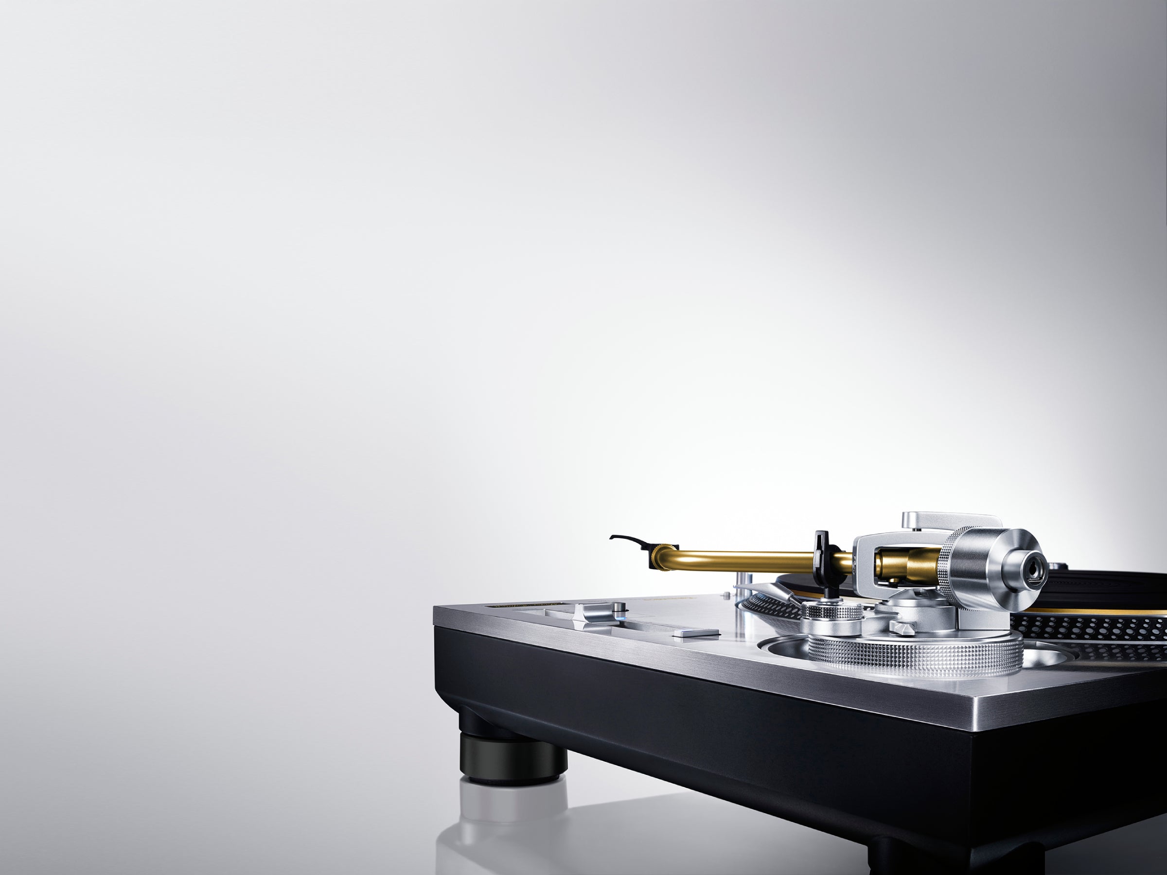 A hairline-processed, 10-mm-thick top panel of immaculate aluminium has been added to the previous three-layered construction of aluminium die-cast, BMC, and heavyweight-class rubber on the SL-1200MK5. This four-layered construction combines high rigidity with a high-quality finish and feel.
